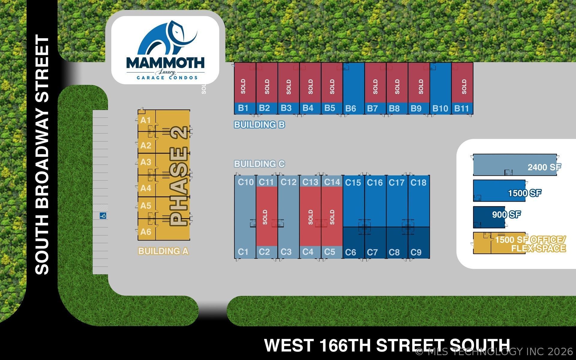 Mammoth Luxury Garage Condos, located just off Hwy 75, offers a unique ownership opportunity for enthusiasts and businesses seeking premium storage and flex space. These Class A garage condos are designed for versatility, accommodating collectible autos, RVs, boats, and other high-value assets while providing room for hobby areas or business operations. This 900 sq ft unit is 25' wide and 36' deep with a 16' overhead door; fully insulated with separately metered electric service, dedicated RV outlets and LED lighting, water/sewer connections, internet and cable access, and a pedestrian door. Buyers can customize their space with options such as mezzanines, HVAC systems, epoxy flooring, and built-in cabinetry to create a personalized environment. The development includes gated and fenced access with 24/7 security monitoring, wide drive aisles (approx. 68'+) for maneuverability. Drive times: 10 minutes to Tulsa Hills, 15 minutes to South Tulsa, 20 minutes to downtown Tulsa. Invest in your very own storage solution to safeguard your prized possessions.