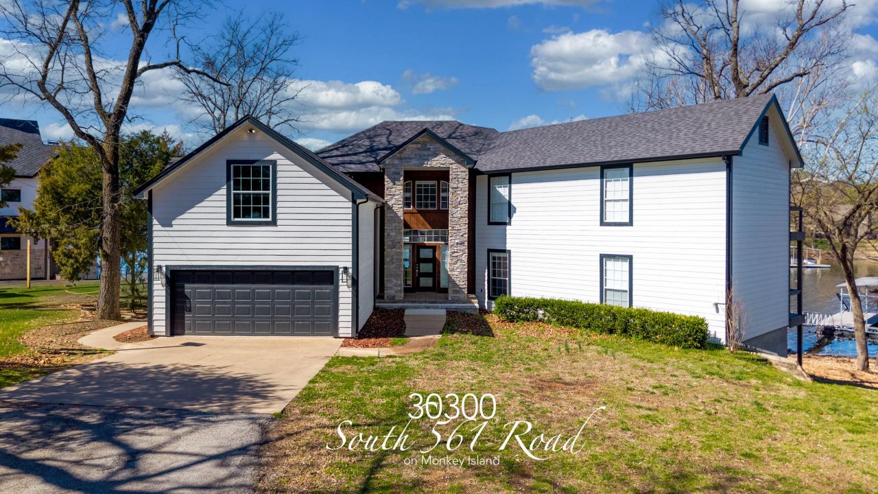 Experience premier lakefront living on Monkey Island in this fully renovated 4-bedroom retreat. Designed for the ultimate lake lifestyle, each bedroom offers stunning water views and private patios. The open-concept interior features soaring ceilings and dramatic floor-to-ceiling windows that frame the beauty of Grand Lake. Step out your back door to the shoreline, where a gentle slope leads directly to your 36x40 two-slip dock. Inside, a spacious flex room offers the option for an additional bedroom, game room, or second living area. The chef-inspired kitchen and custom rock fireplace create a warm, inviting space for gathering. Evenings are perfect around the lakeside firepit, while the nearby golf cart path provides easy access to golf courses, restaurant, and all Shangri-La amenities.