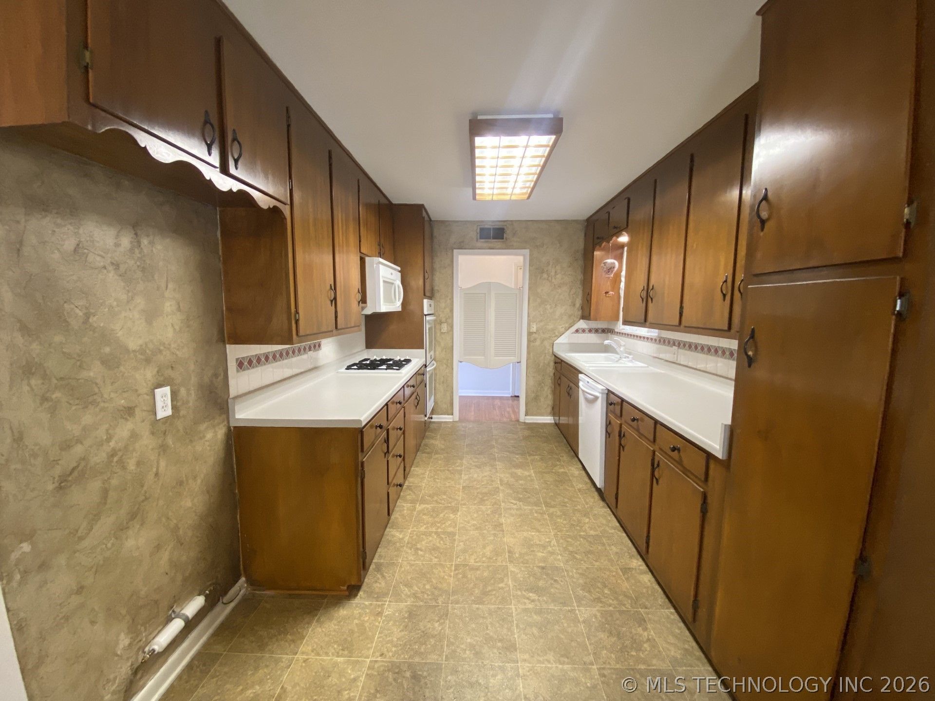 Walk to Darlington Park! Immaculately kept mid-century charmer with so much character! Original hardwood flooring. Two living areas. Gas log fireplace in dining/den. Galley kitchen with built-in double oven. Large wall to floor window in living room overlooks beautiful and secluded fully fenced back yard. Large open patio with BBQ grill and chiminea for tenant use (not warranted by owner). Master bedroom and private bath with shower. Each bedroom has two closets. Attic fan and large linen closet in hall. Laundry in garage. Owner managed - prefers no pets, but may consider one smallish animal. Wonderful mid-town location close to expressway. Easy access to downtown, Broken Arrow - be anywhere within minutes! TWO FULL BATHS! Shed not for tenant use.