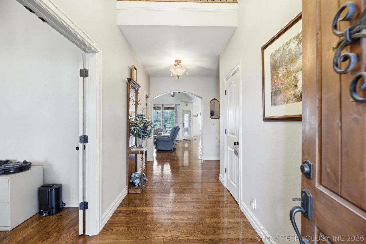 Pristine home in a highly desirable Sapulpa neighborhood! This beautiful property features a spacious open-concept living area with living area with rich hardwood floors, seamlessly flowing into a large kitchen with ample cabinetry and a dining space overlooking the backyard pool perfect for entertaining. The downstairs primary suite offers a private retreat with a luxurious en-suite bath, complete with double sinks, whirlpool tub, separate shower, and a generous walk-in closet. Upstairs, you'll find two additional oversized bedrooms with walk-in closets, along with a versitile game room that could easily serve as a fourth bedroom. Enjoy abundant storage throughout, including a bonus walk-out attic space with flooring. The home also featurres a side-entry three car garage with clean, finished tile flooring. Step outside to your private covered patio and relax by the sparkling pool, ideal for enjoying peaceful evenings or hosting gatherings. This home truly has it all, space, comfort, and great amenities in a fantastic location!