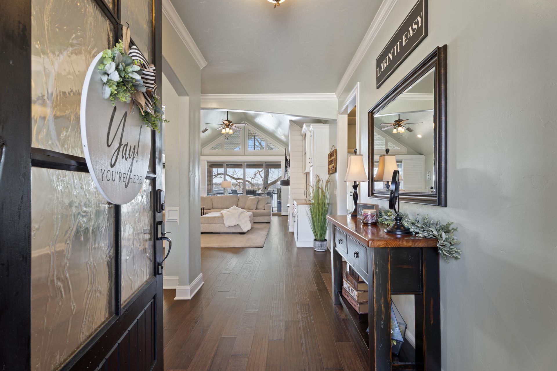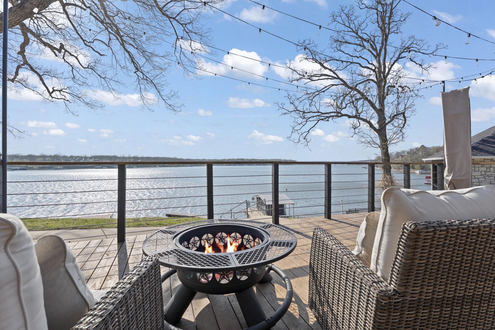 Experience elevated lake living on Honey Creek with unobstructed bridge views and breathtaking sunsets. This fully furnished 5 bed, 4.5 bath estate offers approx. 5,500 sq ft on 1 private acre at the end of a quiet dead-end road with no HOA. Designed for entertaining, the open-concept interior features a remodeled kitchen with custom cabinetry, wine fridge, sonic ice maker, and stainless appliances. Main-level primary suite offers a spa-like bath with soaking tub, oversized shower and gym. Lower level includes 2 bedrooms, 1 bathroom with additional flex space. The upstairs offers an expansive bunk room that sleeps 6 with full bath. Enjoy 102 ft of shoreline, private dock with HydroHoist lift, and a 25x70 deck with outdoor kitchen and fireplace--perfect for sunset lake nights.