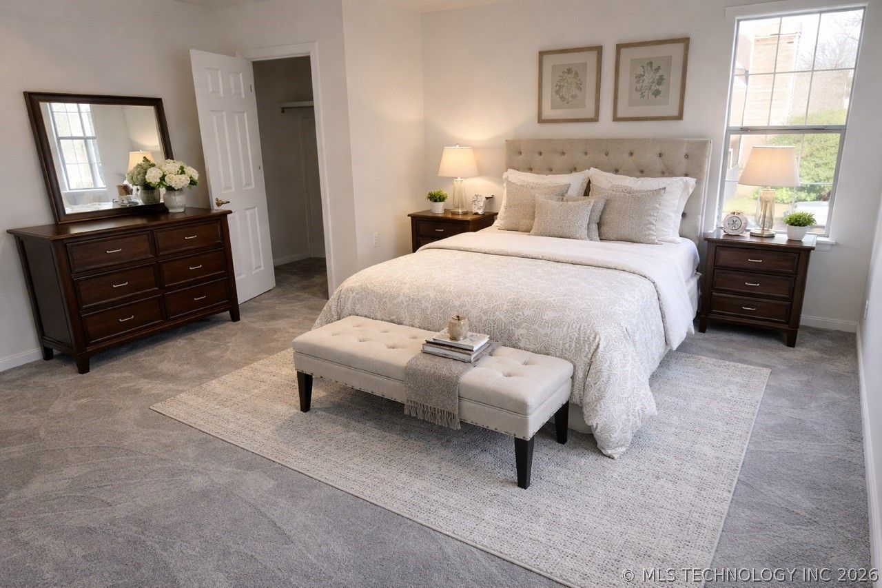 Very well maintained home in Jenks school district on corner of cul-de-sac. Close to shopping and Creek Turnpike. Large master bedroom with fireplace, master bath with jacuzzi tub. Jack and Jill bath for other 2 bedrooms. Utility is conveniently upstairs. All bedrooms have nice walk-in closets with shelving. New roof in 2024. New hot water tank and exterior painting in 2023. Gas GENERAC generator. Irrigation system recently service and sprinkler heads replaced. Entire house has been painted inside new carpet in all three bedrooms - new wood laminate flooring downstairs new master shower and new tile in master - both fireplaces have been refaced with new tile and paint Staging is Ai generated new quartz countertop in kitchen. New deck off breakfast area new front door